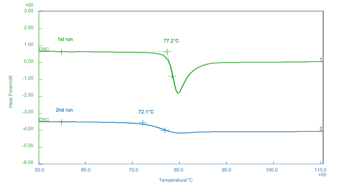 1st run(首次加热):曲线在约 77.2℃ 处出现了明显的基线偏移,同时伴随一个尖锐的吸热峰。这个峰就是——焓松弛(enthalpy relaxation)现象,它反映了 PET 在室温下长期存放后,分子链从 “冻结” 的非平衡态向更稳定的平衡态调整时吸收的热量。2nd run(二次加热):当我们把 PET 加热到 Tg 以上,消除了之前的热历史后再重新测试,曲线在约 72.1℃ 处只表现为平滑的基线偏移,那个尖锐的吸热峰消失了。